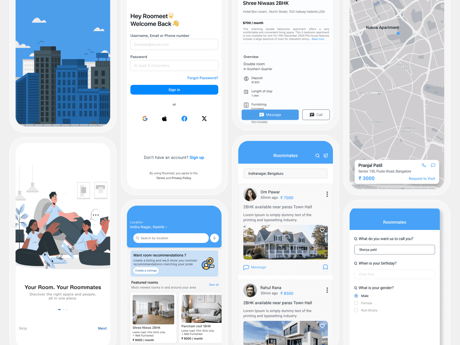 Roomeet is a smart room and roommate rental platform designed to simplify the process of finding compatible roommates and available rooms. I worked as the UX/UI Designer and Project Manager, leading the research, defining the user experience strategy, and designing interaction flows to support efficient discovery, matching, and communication within a complex rental ecosystem.